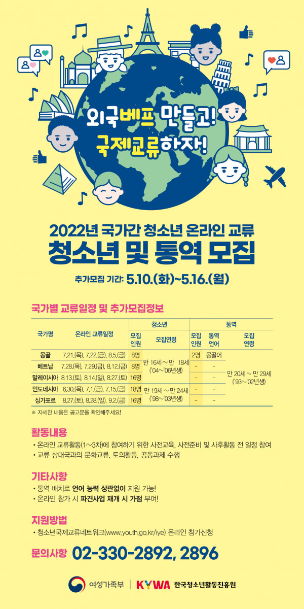 [한국청소년활동진흥원] 2022년 국가간 청소년 온라인 교류 청소년 및 통역 추가모집 공고