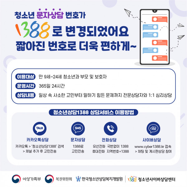 [여성가족부] 청소년상담1388 문자상담 번호 변경 안내 페이지 정보 작성자 관리자 작성일2022.01.10 조회7,493회 댓글0건 본문 댓글목록 등록된 댓글이 없습니다. 이전글 다음글 목록
