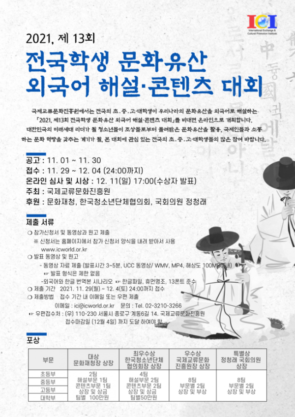 「2021, 제13회 전국학생 문화유산 외국어 해설·콘텐츠 대회」를 비대면 온라인으로 개최합니다.
