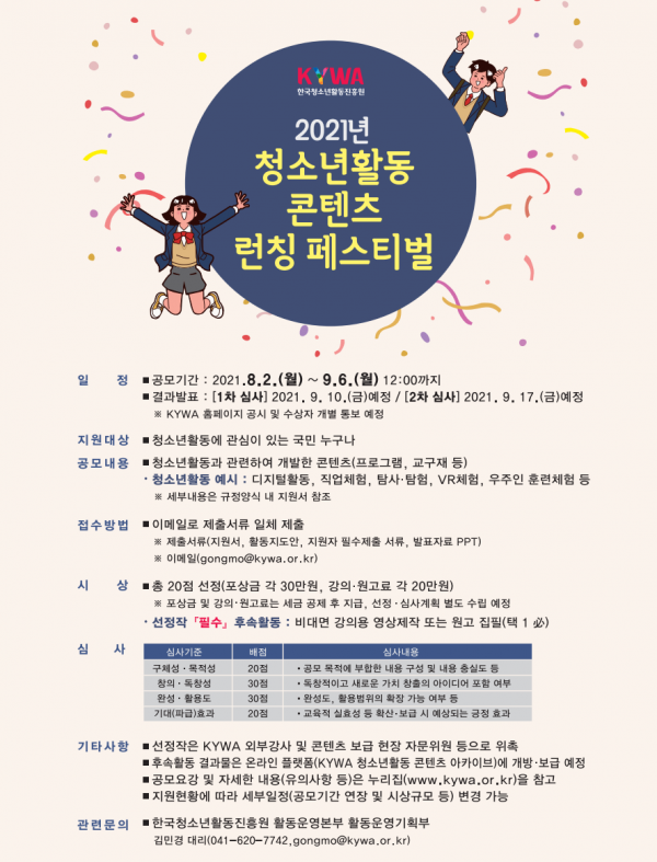 '2021년 청소년활동 콘텐츠 런칭 페스티벌' 프로그램 공모전 연장공모 안내 페이지 정보 작성자 관리자 작성일2021.08.30 조회9,798회 댓글0건 첨부파일 붙임1_2021년_청소년활동_콘텐츠_런칭_페스티벌_공고문.hwp (114.5K) 159회 다운로드 본문 * 자세한 사항은 붙임을 참고해 주시기 바랍니다. 댓글목록 등록된 댓글이 없습니다. 이전글 다음글 목록