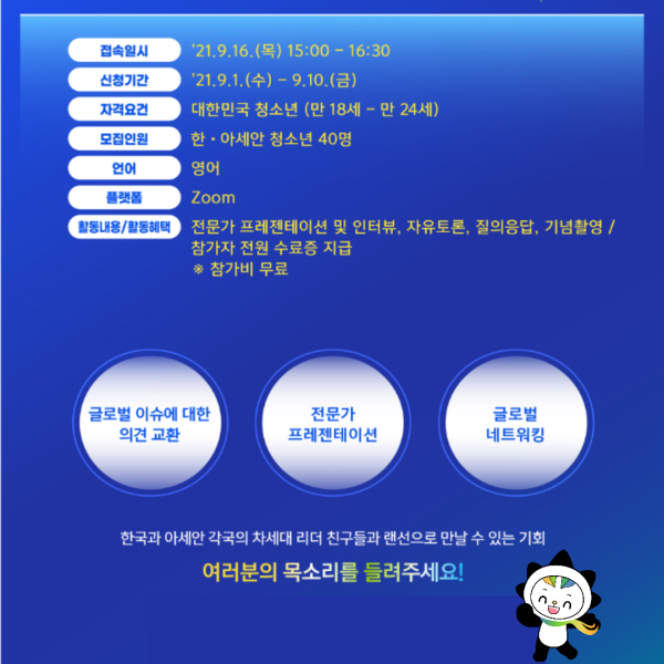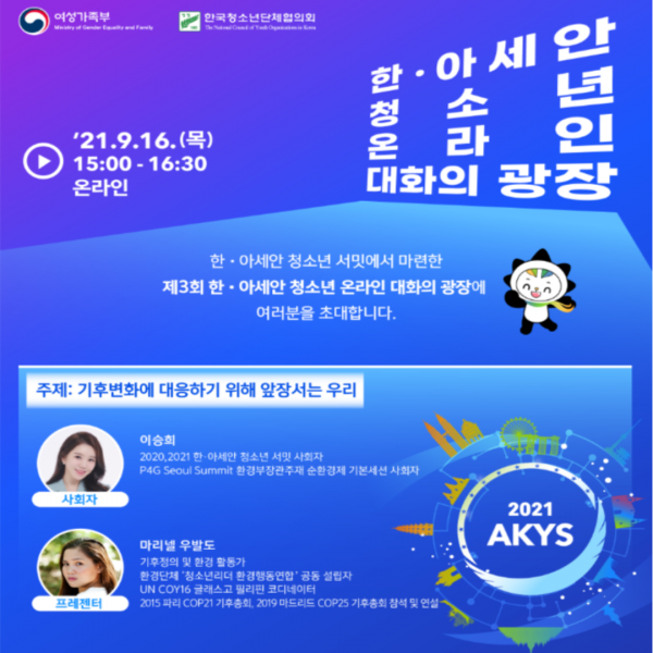 오는 9월 16일(목)에 열리는 제3회 한‧아세안 청소년 온라인 대화의 광장의 참가자를