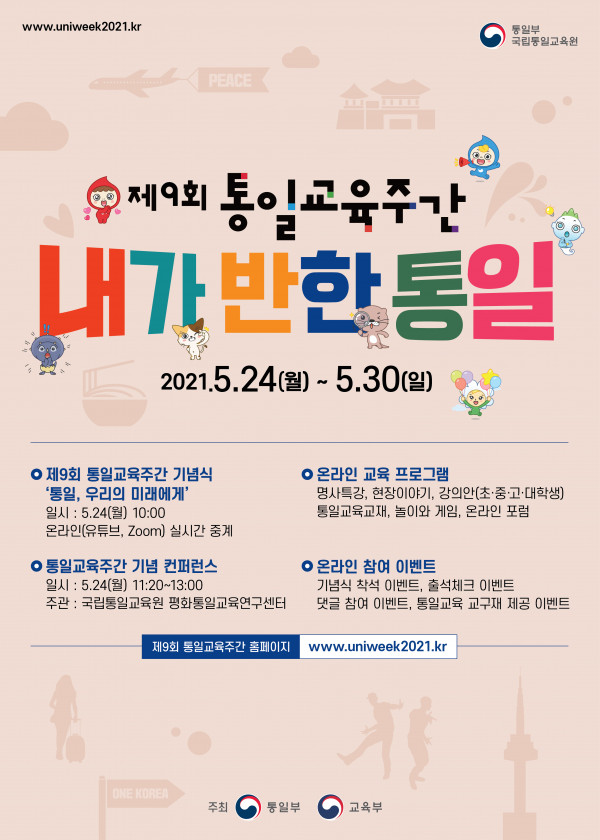 [국립통일교육원] 제9회 통일교육주간(5.24~30) 안내 페이지 정보 작성자 관리자 작성일2021.05.11 조회49,476회 댓글0건 본문 * 자세한 사항은 해당 홈페이지 www.uniweek2021.kr를 참고해 주시기 바랍니다. 댓글목록 등록된 댓글이 없습니다. 이전글 다음글 목록