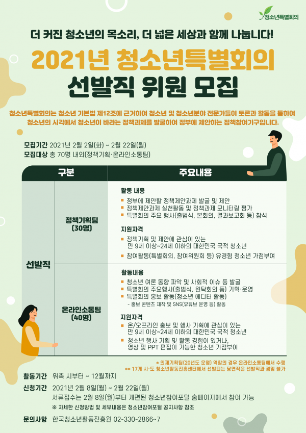 [한국청소년활동진흥원] 2021년 청소년특별회의 선발직 위원 모집 홍보요청