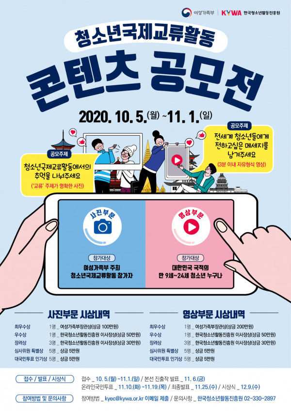 2020년 청소년국제교류활동 콘텐츠 공모전 안내 페이지 정보 작성자 관리자 작성일2020.10.12 조회56,159회 댓글0건 첨부파일 _공고_2020년_청소년국제교류활동_콘텐츠_공모전_안내.hwp (27.0K) 184회 다운로드 본문 * 자세한 사항은 붙임을 참고하시기 바랍니다. 댓글목록 등록된 댓글이 없습니다. 이전글 다음글 목록