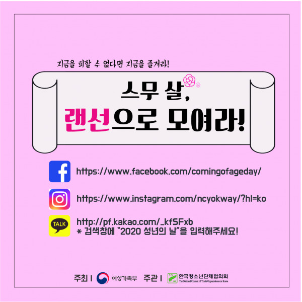 - 카카오톡플러스친구 ID : 2020 성년의 날 (또는 coad2020)