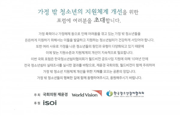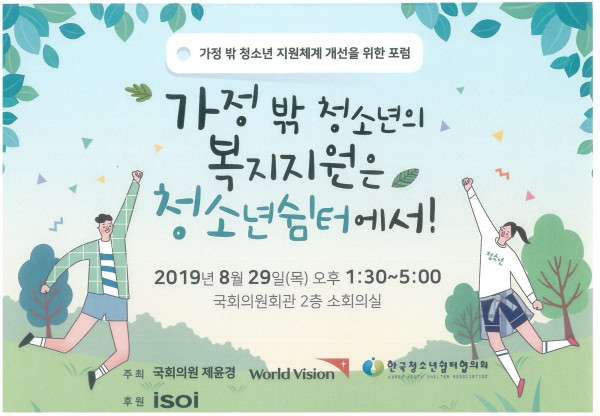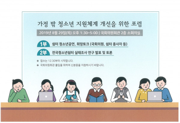[가정 밖 청소년 지원체계 개선을 위한 포럼] 가정 밖 청소년의 복지지원은 청소년쉼터에서! 페이지 정보 작성자 관리자 작성일2019.08.28 조회20,238회 댓글0건 본문 첨부된 초청창 참조. 끝. 댓글목록 등록된 댓글이 없습니다. 이전글 다음글 목록