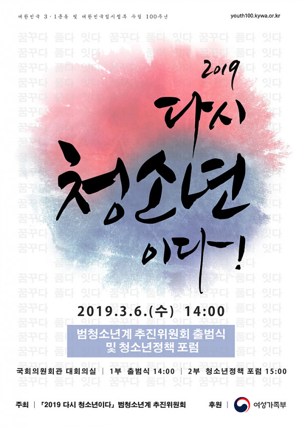 대한민국 미래 100년「2019 다시 청소년이다」범청소년계 추진위원회 출범식 및 청소년정책포럼 참가자 모집 안내