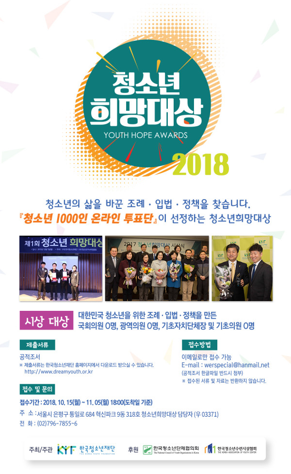 [한국청소년재단] 2018 청소년희망대상을 알립니다. 페이지 정보 작성자 관리자 작성일2018.10.11 조회27,128회 댓글0건 첨부파일 2018년+청소년희망대상+수상후보자+공고문__2_.hwp (10.5K) 85회 다운로드 본문 2018 청소년희망대상 안내 * 세부사항은 상기 붙임파일 또는 한국청소년재단 홈페이지 참조 요망 댓글목록 등록된 댓글이 없습니다. 이전글 다음글 목록