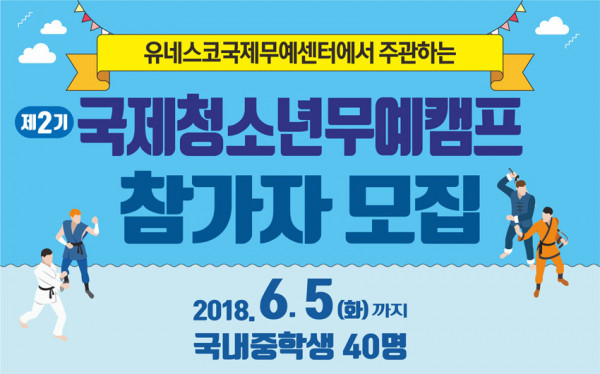 유네스코국제무예센터에서는 청소년 발달과 참여를 통한 국제협력 증진을 위해 세계 청소년 6개국 80명이 참가하는 『제2기 국제청소년 무예캠프』를 개최할 계획으로 이에 해외 청소년들과 캠프활동을 함께할 국내참가자를 모집합니다.