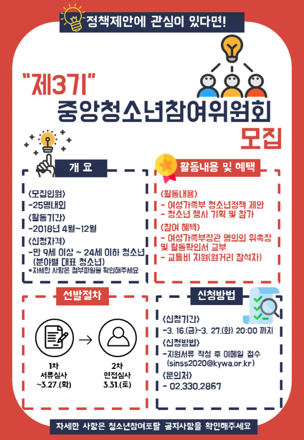 (한국청소년활동진흥원) 2018년도 제3기 중앙청소년참여위원회 위원 선발(~29일까지)