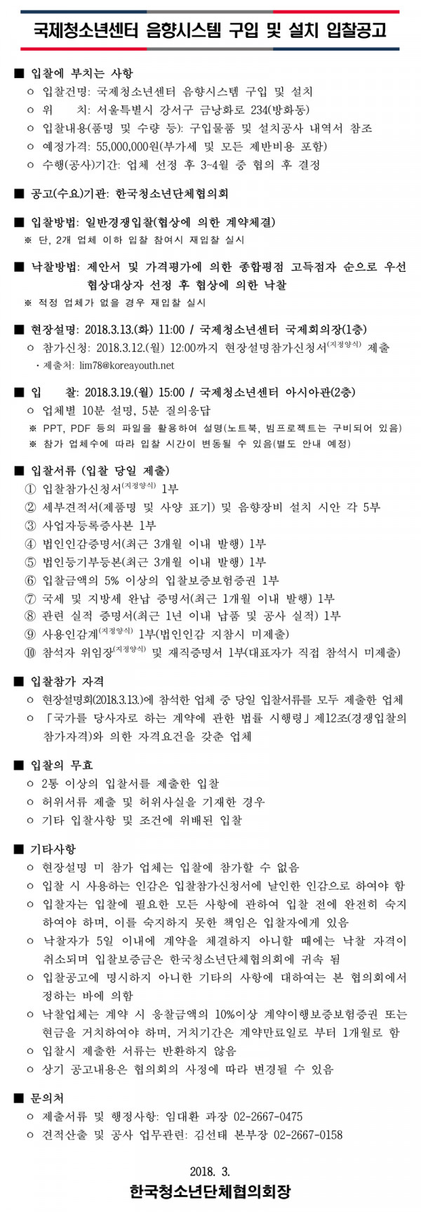 국제청소년센터 음향시스템 구입 및 설치 입찰공고