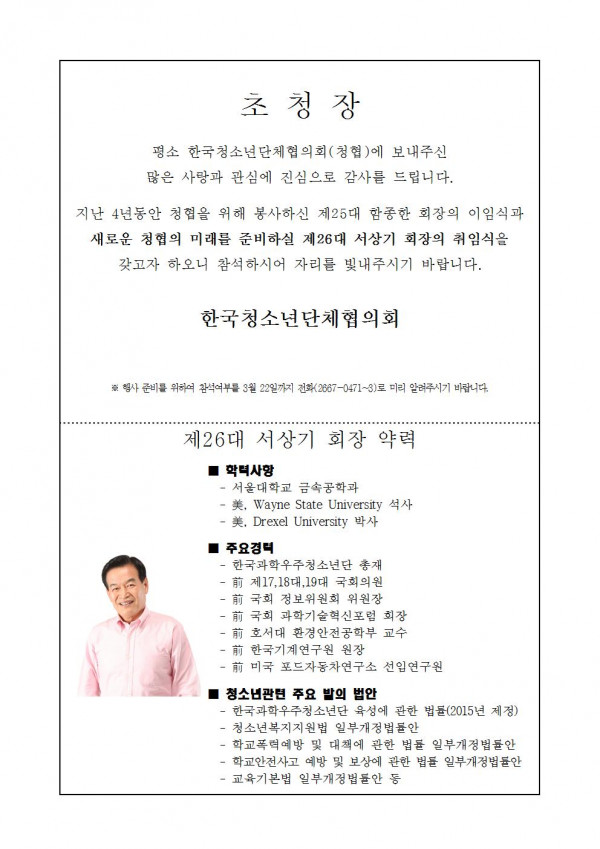 한국청소년단체협의회 제25대·제26대 회장 이·취임식 안내