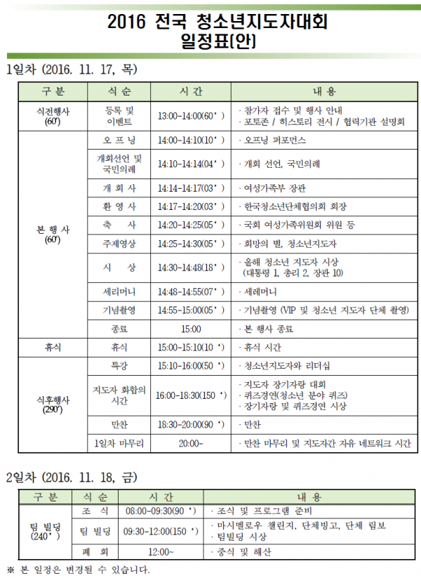 2016 전국 청소년지도자대회 일정 및 셔틀버스 안내