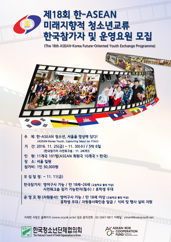한국청소년단체협의회에서는 청소년들에게 미래사회 주인공으로서의 책임의식을 고취하고 국제사회의 변화와 도전에 대한 올바른 인식을 제공하고자 ASEAN(동남아시아 10개국) 회원국의 청소년 대표들을 한자리에 모아 “제18회 한-ASEAN 미래지향적 청소년교류: 한-ASEAN 청소년 스퀘어”를 개최하고자 합니다.