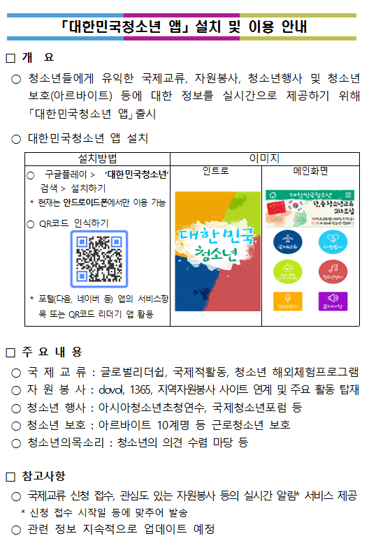 대한민국청소년 앱 설치 및 이용 안내(여성가족부) 페이지 정보 작성자 관리자 작성일2015.06.02 조회22,617회 댓글0건 본문 .. 댓글목록 등록된 댓글이 없습니다. 이전글 다음글 목록