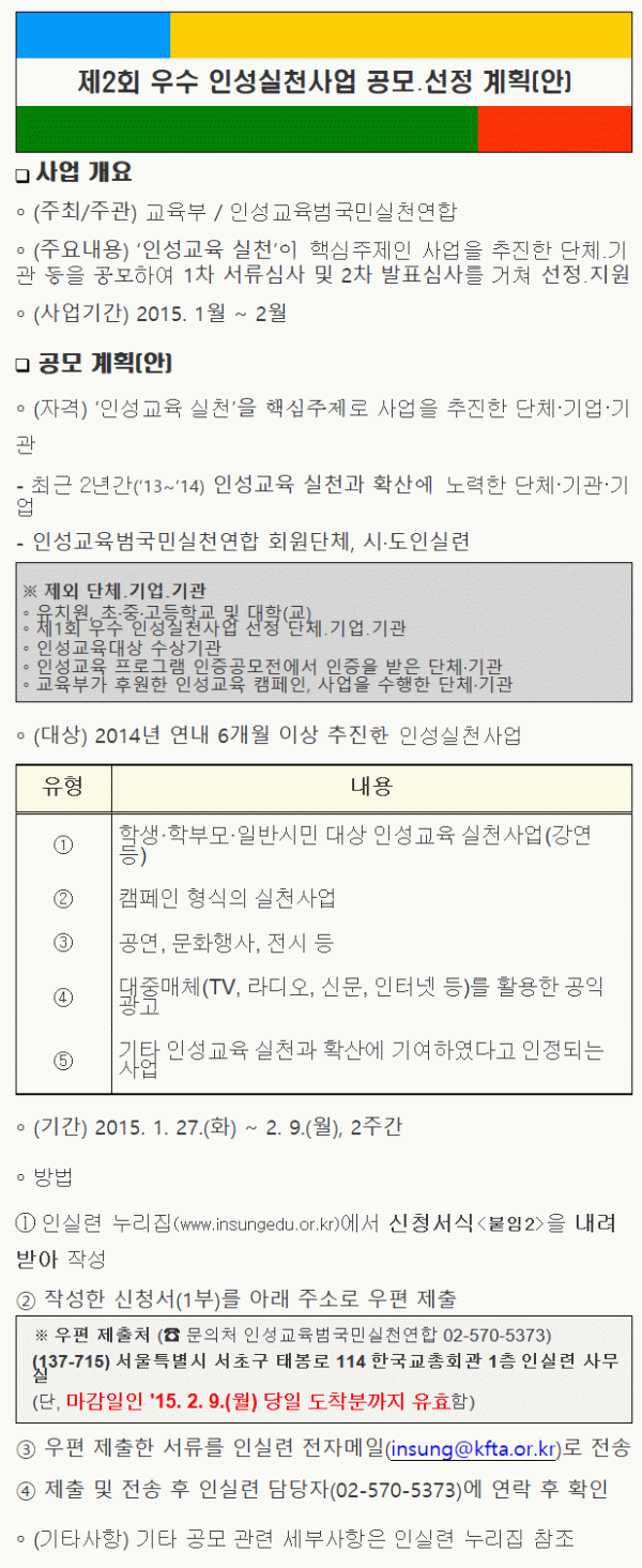 제2회 우수 인성실천사업 공모․선정 계획(안)