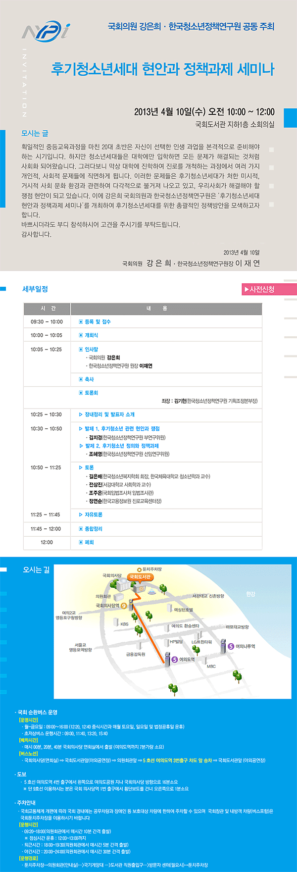 [공지] 후기청소년시대 현안과 정책과제 세미나 페이지 정보 작성자 관리자 작성일2013.04.04 조회13,255회 댓글0건 본문 댓글목록 등록된 댓글이 없습니다. 이전글 다음글 목록