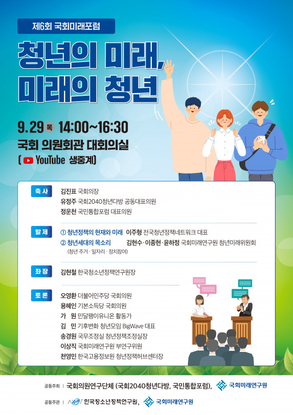 ※ 현장 참석(국회 의원회관 대회의실) 또는 온라인 실시간 중계(국회미래연구원, 한국청소년정책연구원 공식 유튜브