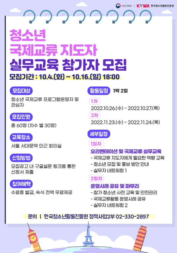 [한국청소년활동진흥원] 2022년 청소년 국제교류 지도자 역량개발 실무교육 안내 페이지 정보 작성자 관리자 작성일2022.10.11 조회8,208회 댓글0건 첨부파일 2022년_청소년_국제교류_지도자_역량개발_실무교육_안내.pdf (85.1K) 150회 다운로드 본문 * 보다 자세한 내용은 붙임 자료를 통해 확인 바랍니다. 댓글목록 등록된 댓글이 없습니다. 이전글 다음글 목록