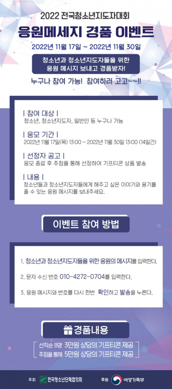 [2022 전국청소년지도자대회] 응원메세지 경품 이벤트 안내 페이지 정보 작성자 관리자 작성일2022.11.18 조회11,107회 댓글0건 본문 ※ 이벤트 내용/취지에 맞지 않는 문자는 경품 대상에서 제외될 수 있습니다. 댓글목록 등록된 댓글이 없습니다. 이전글 다음글 목록