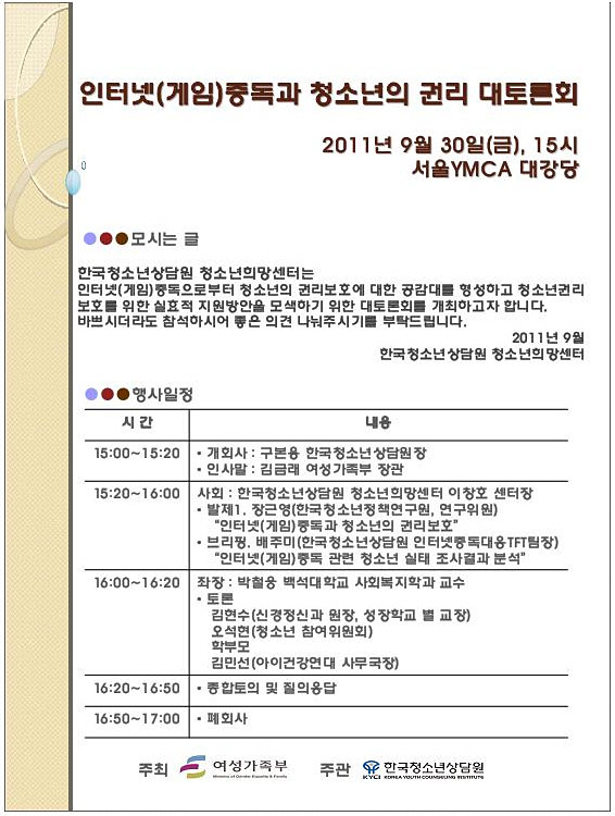 [공지] 인터넷(게임)중독과 청소년의 권리 대토론회 페이지 정보 작성자 관리자 작성일2011.09.22 조회11,751회 댓글0건 본문 댓글목록 등록된 댓글이 없습니다. 이전글 다음글 목록