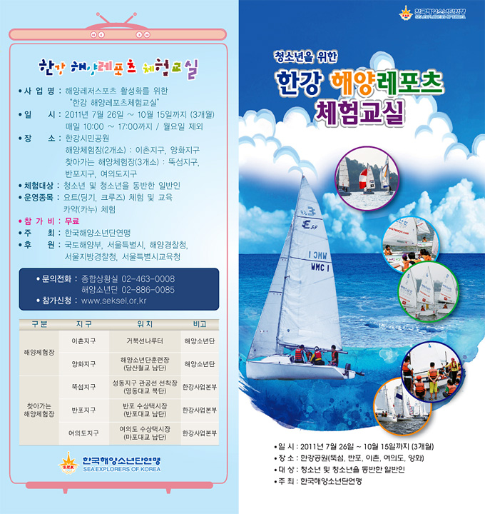 한국해양소년단연맹에서는 해양레저스포츠 활성화와 인구 저변확대를 위해 청소년(초등, 중등, 고등)을 대상으로 한강에서 무료로 해양레포츠체험교실을 운영하고 있습니다.
