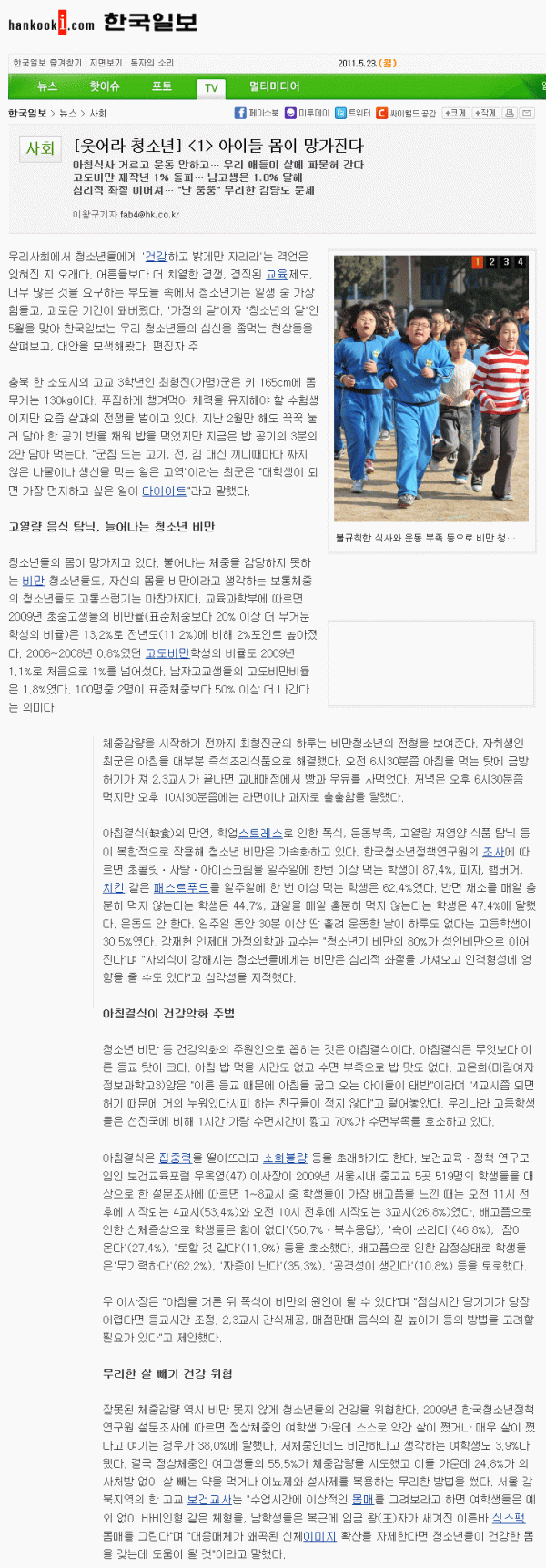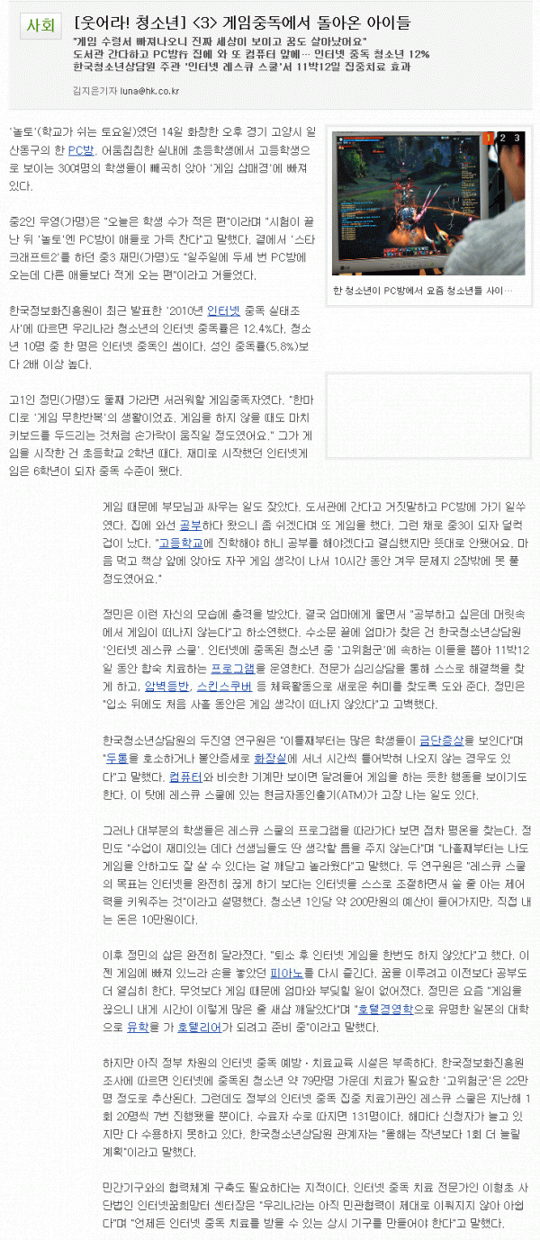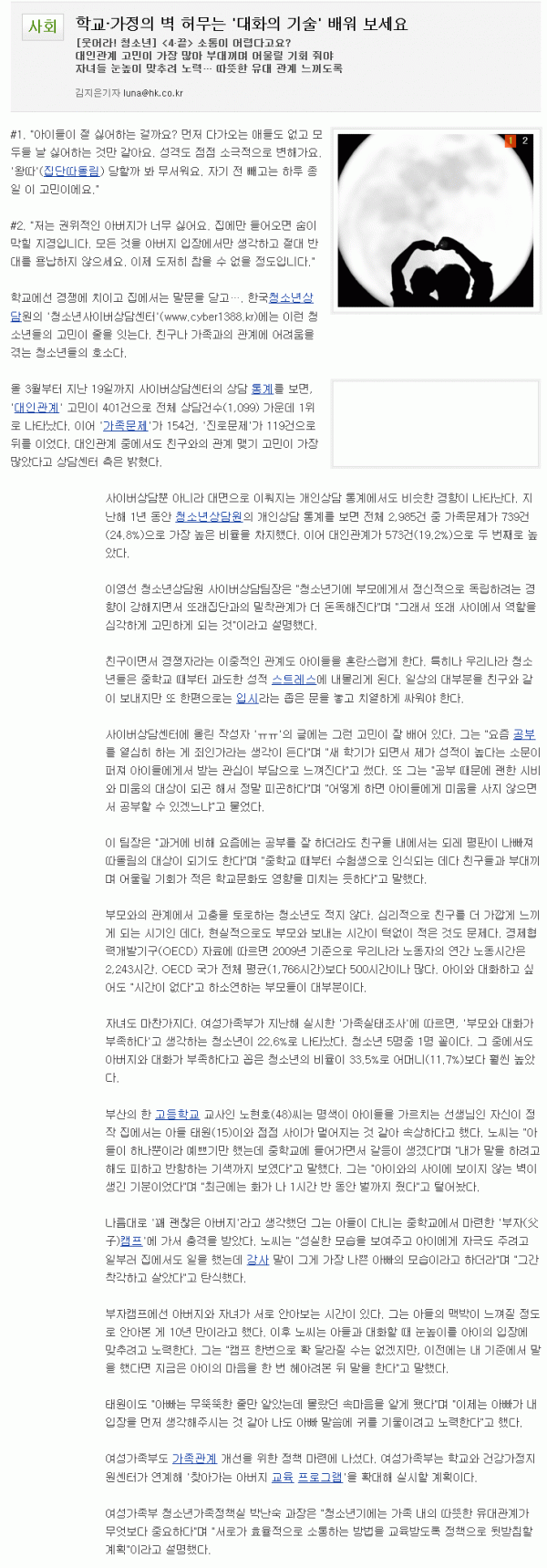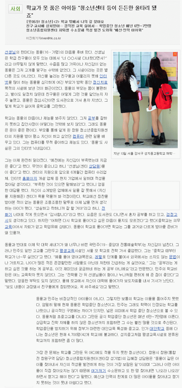 [기획기사] “웃어라! 청소년”(청소년의 신체적ㆍ정신적 건강증진을 위한 사회환경 조성과 관련한 한국일보의 기획기사 입니다) 페이지 정보 작성자 관리자 작성일2011.05.23 조회12,949회 댓글0건 본문 댓글목록 등록된 댓글이 없습니다. 이전글 다음글 목록