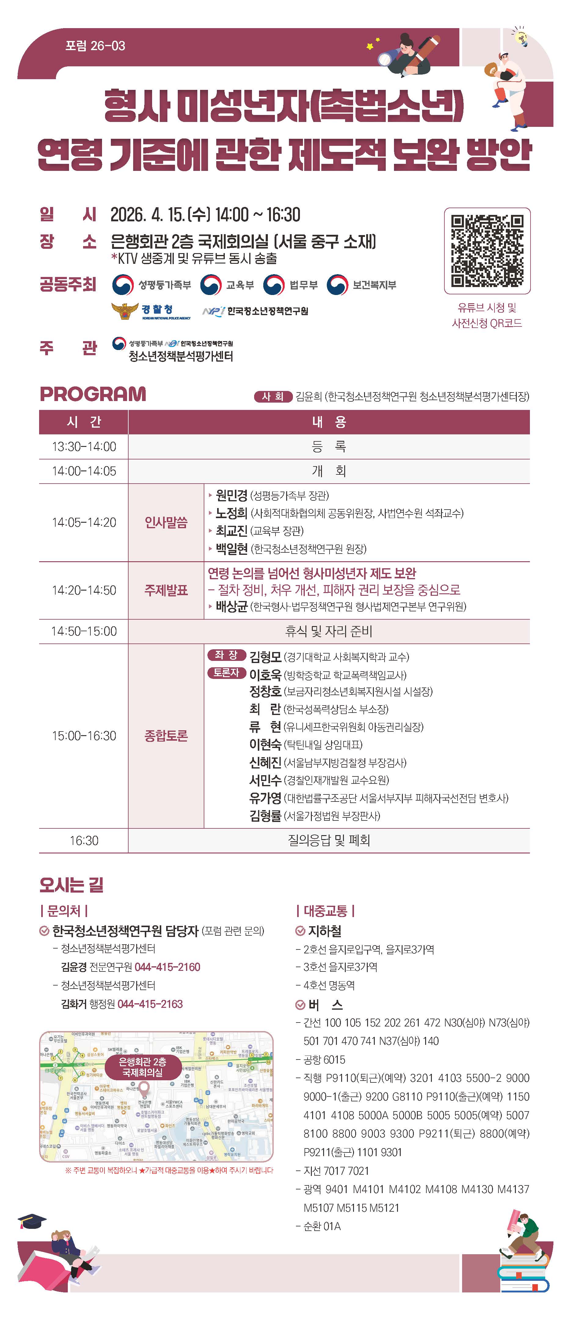 [한국청소년정책연구원] '형사 미성년자(촉법소년) 연령 기준에 관한 제도적 보완 방안' 정책포럼 개최 안내 페이지 정보 작성자 관리자 작성일2026.04.10 조회29회 댓글0건 본문 댓글목록 등록된 댓글이 없습니다. 다음글 목록