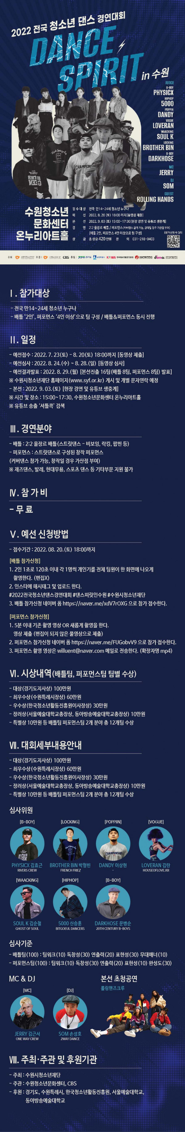 [수원시청소년재단] 2022. 전국 청소년 댄스 경연대회 'DANCE SPIRIT in 수원' 참가자 모집 페이지 정보 작성자 관리자 작성일2022.07.29 조회4,898회 댓글0건 첨부파일 붙임1._2022_전국_청소년_댄스_경연대회_계획안_배포용.pdf (165.0K) 142회 다운로드 본문 * 보다 자세한 내용은 붙임 문서를 통해 확인하시기 바랍니다. 댓글목록 등록된 댓글이 없습니다. 이전글 다음글 목록