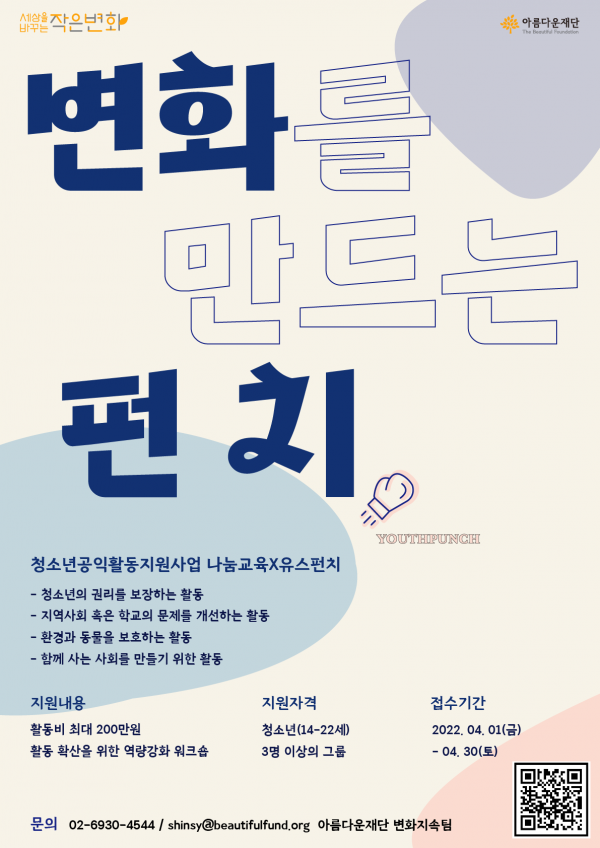 [아름다운재단] 2022 청소년공익활동지원사업 나눔교육x유스펀치 (~4/30)