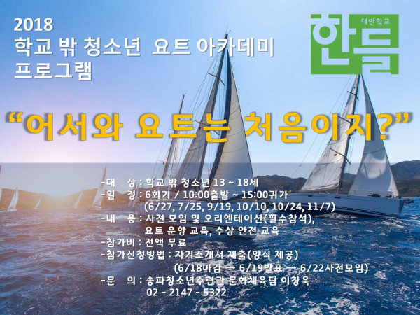 학교 밖 청소년 요트 아카데미 프로그램 페이지 정보 작성자 원혜진 작성일2018.05.28 조회10,069회 댓글0건 본문 어서와 요트는 처음이지----->문의 : 송파청소년수련관 댓글목록 등록된 댓글이 없습니다. 이전글 다음글 목록