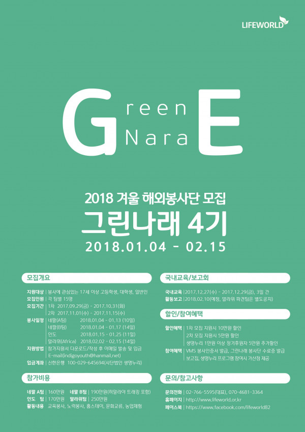 [국제NGO 생명누리] 2018 제4기 그린나래 해외봉사단 1차모집! (~10/31)