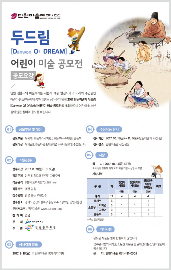 2017단원미술제 두드림[Danwon Of DREAM] 어린이 미술 공모전 공모요강 페이지 정보 작성자 허윤지 작성일2017.08.01 조회9,730회 댓글0건 본문 댓글목록 등록된 댓글이 없습니다. 이전글 다음글 목록