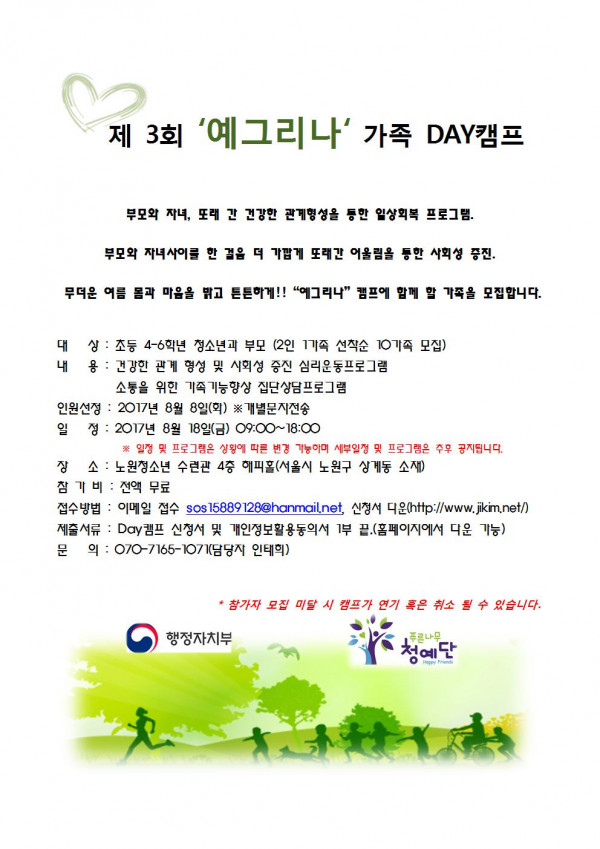 무더운 여름 몸과 마음을 밝고 튼튼하게!! “예그리나” 캠프에 함께 할 가족을 모집합니다.
