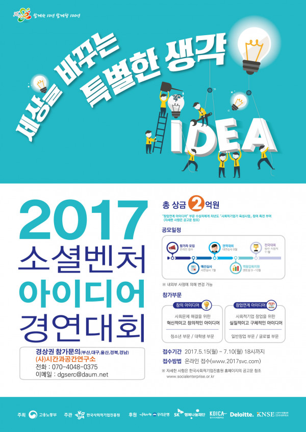 7월 10일까지 온라인으로 접수(www.2017svc.com)를 하고 있으니 사회문제와 관련한 아이디어가 있으시면 꼭 도전해보시기 바랍니다.