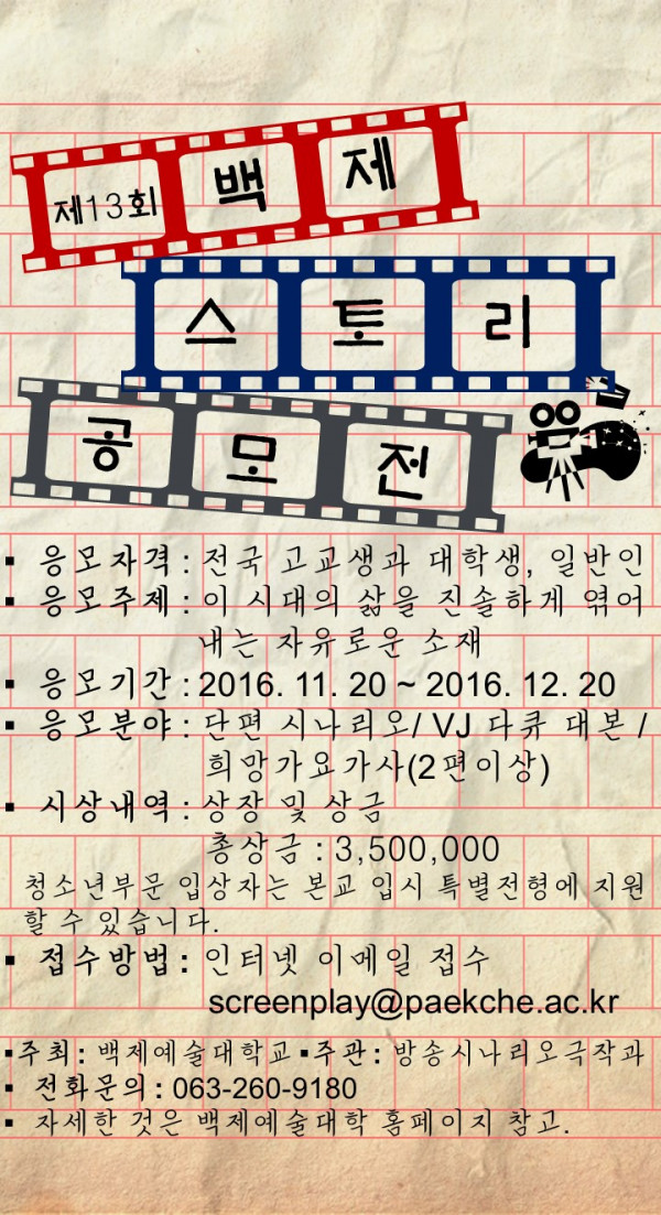 - 입상작의 저작(영화화)권은 백제예술대학 “방송시나리오극작과”에 2년간 귀속되며, 접수 된 작품은 반환되지 않음.