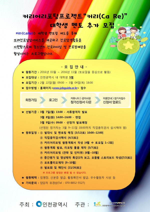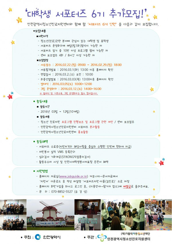 인천광역시청소년진로지원센터 대학생 서포터즈 6기 모집 및 대학생 멘토링 멘토 모집