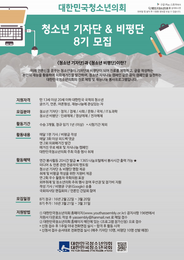 대한민국청소년의회가 주관하는 청소년 기자단 & 비평단 정규모집 中 ~3/20까지