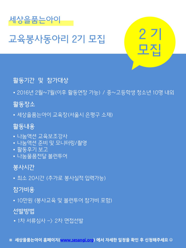 2016년 교육봉사동아리 2기를 모집합니다. 교육봉사동아리는 매주 일요일마다 열리는 ‘나눔액션’ 봉사프로그램에 참여하여 교육보조강사로 활동합니다. 초등학생부터 고등학생까지! 다양한 청소년 친구들이 봉사활동에 즐겁고, 적극적으로 참여할 수 있도록 돕는 역할을 할 것입니다. 새로운 사람들을 만나면서 함께 소통하고, 이 기회를 통해 성장하기를 희망하는 학생들의 많은 지원 바랍니다.
