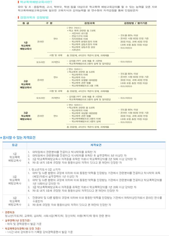 : 학교폭력상담사 2,3급 각 20,000원 / 학교폭력예방교육사2급 각20,000원, 3급 25,000원 /