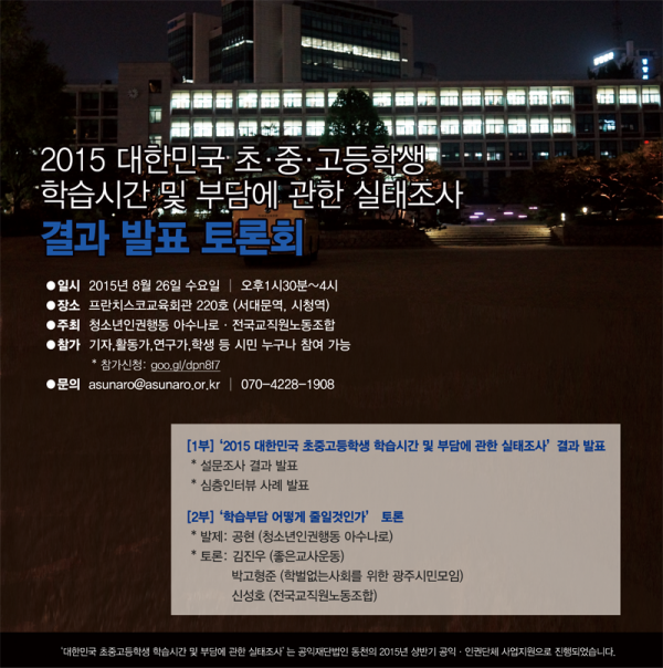세계 최장 수준이라는 대한민국 학생들의 학습시간, 대체 얼마나 길까요? 학교와 학원에 저녁을 빼앗긴 학생들은 얼마나 될까요? 8월26일 진행되는 결과발표회에서는 전국 6,261명의 초,중,고 학생들이 참여한 <2015 대한민국 초중고등학생 학습시간 및 부담에 관한 실태조사>를 통해 2015년 대한민국 학생들의 학습시간, 강제학습, 학습부담 등 ‘비인간적인 학습실태’ 문제를 고발합니다.