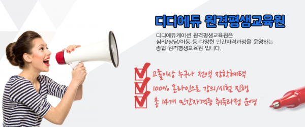 안녕하세요. 평생 교육원 ㈜디디에듀입니다. 저희 교육원에서는 2015 취업난 해소에 조금이나마 도움이 되어 드리고자 방과후교사, 유아아동교육, 부모교육 영역에서 전문성과 스펙을 제고할 수 있는 100% 온라인 교육과정을 운영하고 있습니다. 현재 제공되고 있는 직업·민간자격증 교육 컨텐츠는 자격 기본법에 의해 한국 직업능력개발원에 공식 등록 되어 있으며, 모든 온라인 교육 과정을 전액 무상교육으로 지원하는 프로그램을 시행하게 되었습니다.
