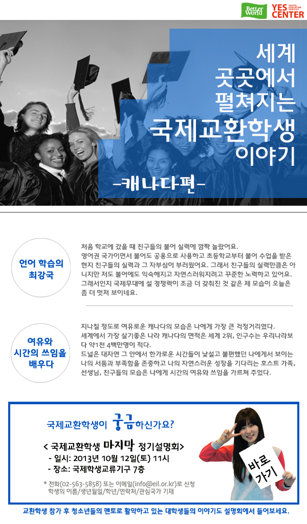 시간의 쓰임과 여유를 배우다, 캐나다 국제교환학생 페이지 정보 작성자 이새롬 작성일2013.09.17 조회9,570회 댓글0건 본문 http://www.eil.or.kr/isp/isp_002_01.php 댓글목록 등록된 댓글이 없습니다. 이전글 다음글 목록