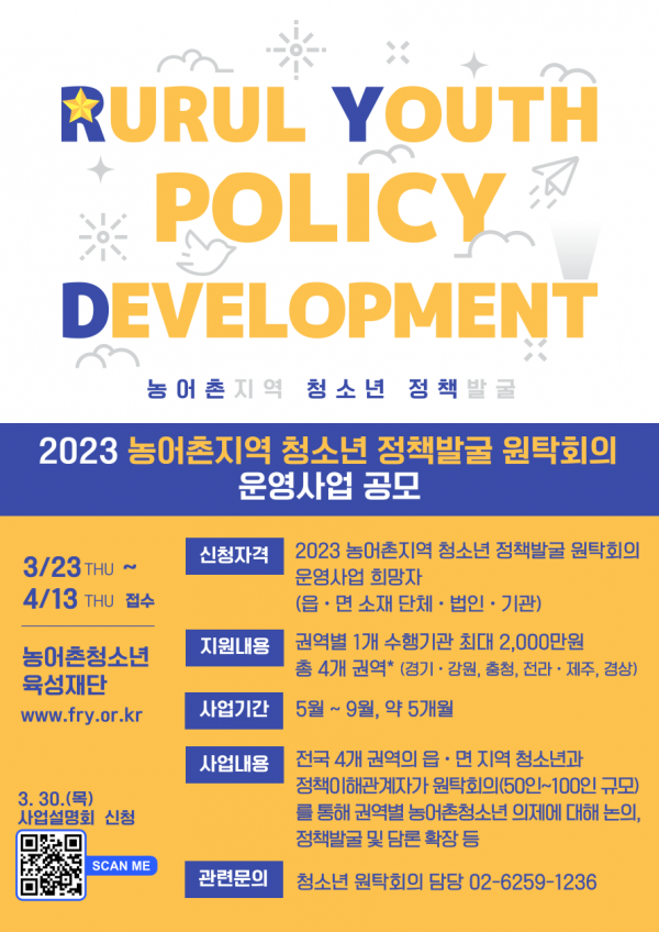 확산을 위해 『2023년 농어촌청소년 정책발굴 원탁회의 운영사업』을 공모합니다. 관심 있는 단체·기관·법인의 많은 참여를 바랍니다.