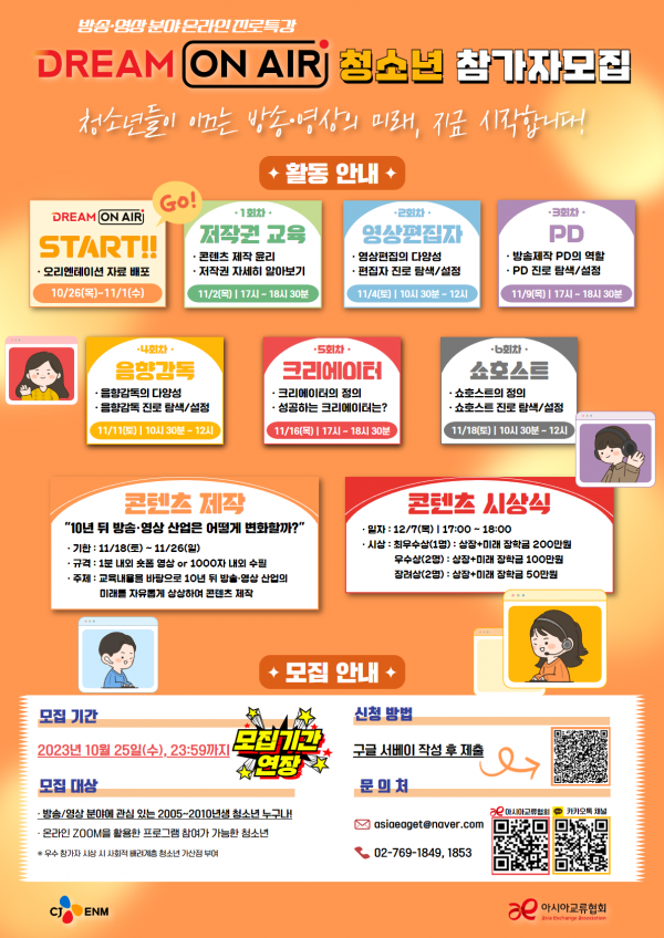 [아시아교류협회] 방송·영상분야 청소년 온라인 진로특강 「드림 온 에어 4기」의 청소년 참가자를 모집합니다! 페이지 정보 작성자 아시아교류협회 작성일2023.10.12 조회2,412회 댓글0건 첨부파일 드림 온 에어 4기 청소년 참가자 모집공고문기간연장.pdf (265.4K) 80회 다운로드 본문 [드림 온 에어 4기] 청소년 참가자 모집 ~10/25(수) 댓글목록 등록된 댓글이 없습니다. 이전글 다음글 목록